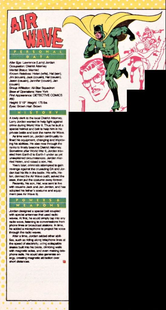 RADIO BELT [Body: 5, Magnetic Control: 6, Running: 20, Super Hearing: 8, Telepathy: 30, R#: 2] Limitations: Super Hearing can only be used to eavesdrop on phone conversations when he has access to appropriate phone lines; Running may only be used to move along phone lines; Telepathy represents ability to place a telephone call from any location. To receive such a communication, the listener must have access to a telephone receiver.